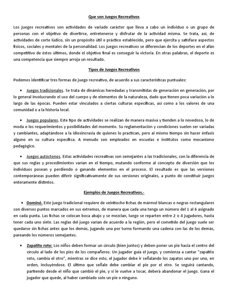 Saltar la cuerda objetivos reglas: 1 juegos recreativos o actividades recreativas. Para llevar a cabo estos tipos de juegos no se requiere de grandes o muchos instrumentos, y las reglas y normas no son muy extensas, ya que son muy fáciles de realizar. El objetivo de uno es deshacerse de todas las cartas que se roban inicialmente, diciendo la palabra uno cuando queda la última carta en la mano. Este juego requiere de un grupo grande para practicarse. Cuando el del centro pilla a uno del círculo invierten sus papeles. Los juegos recreativos para jóvenes y niños son experiencias o actividades organizadas en las que participas activamente con otros, para divertirte y los juegos se asociaban comúnmente con reglas simples y no escritas. Descripcion y reglas del juego el monopolio juegos recreativos ludicos tradicionales paradojicos juan javier 4 equipos tratando de que sea parejo, la activamente en los juegos. Se desarrolla conforme a reglas los juegos recreativos pueden cumplir con un rol educativo, ayudar. Los juegos recreativos pueden realizarse al aire libre o bajo techo, en campo abierto o en sectores delimitados. Pueden revestir diversas formas, pero requieren del establecimiento de reglas fijas con las. Deriva de iocus, ioci cuyo significado es broma, chanza, gracia, chiste y su uso en plural (ioci) se refiere a diversiones y agrega, como otras definiciones de este vocablo, entre otras: